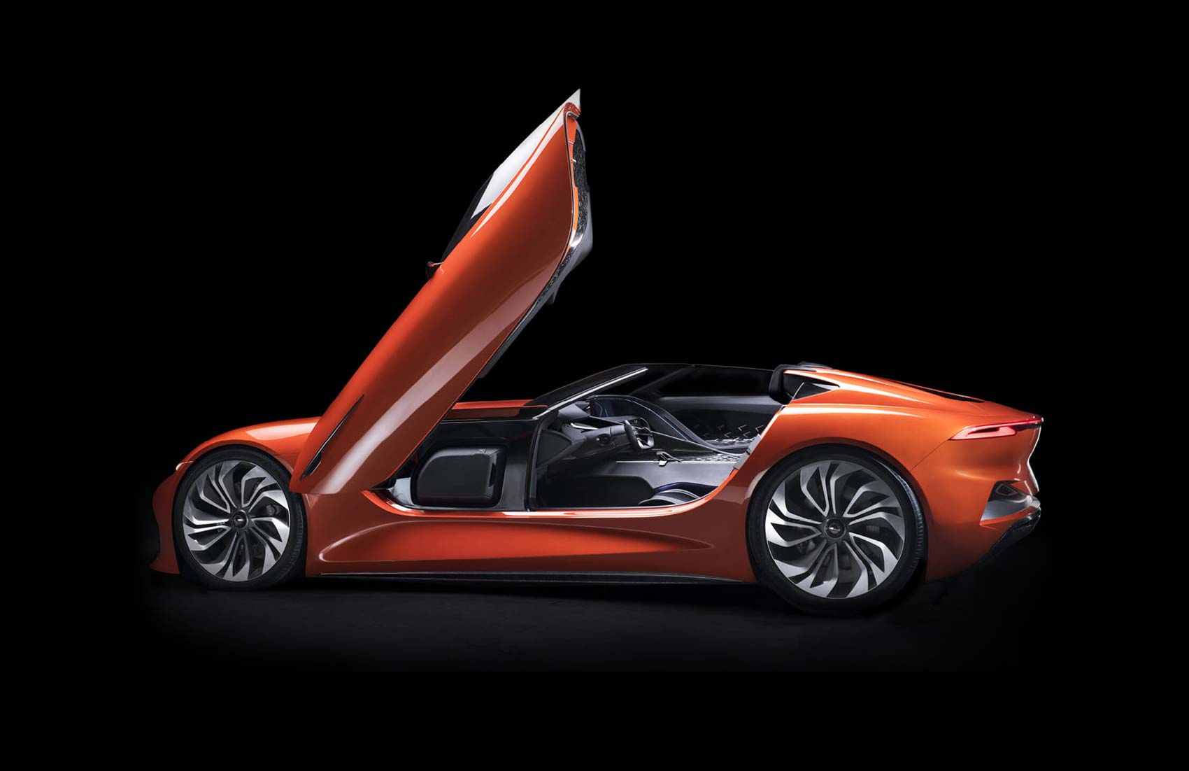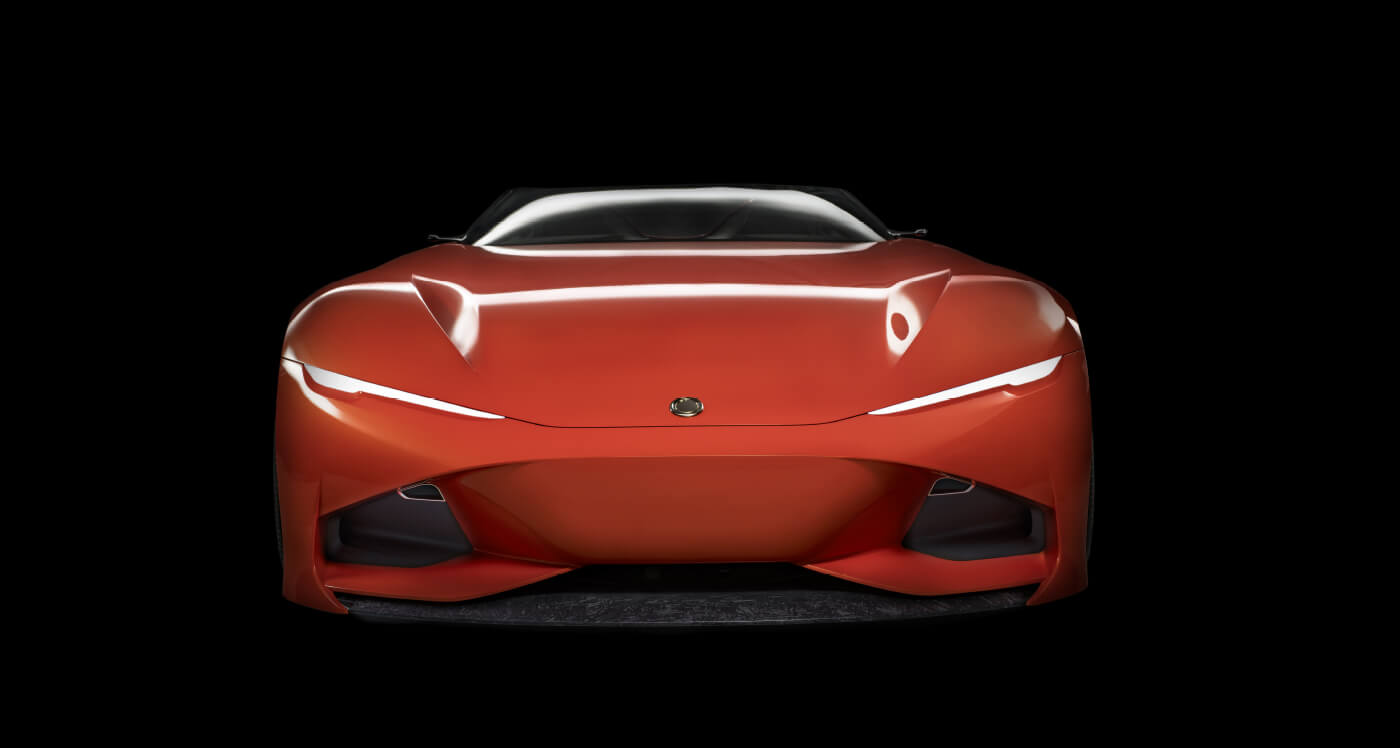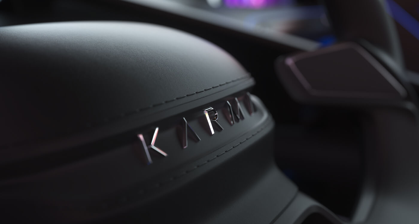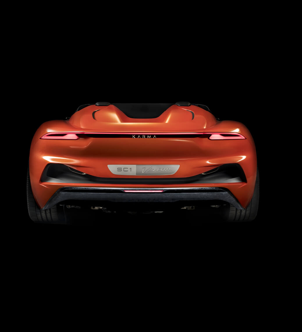 Sculptural headrests spill out from the cabin to meet the rear spoiler as a free-flowing, one-piece cradle gently cascades down to cocoons both driver and passenger. Using never-before-seen materials and finishes including chopped carbon fiber flakes to structure the center console give the Karma SC1 Vision Concept unique personality and voice.
